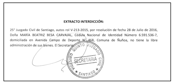 AVISO : EXTRACTO INTERDICCIÓN A DOÑA MARIA BEATRIZ BESA CARVAJAL, 25° JUZGADO CIVIL DE SANTIAGO, AUTOS ROL V-213-2015