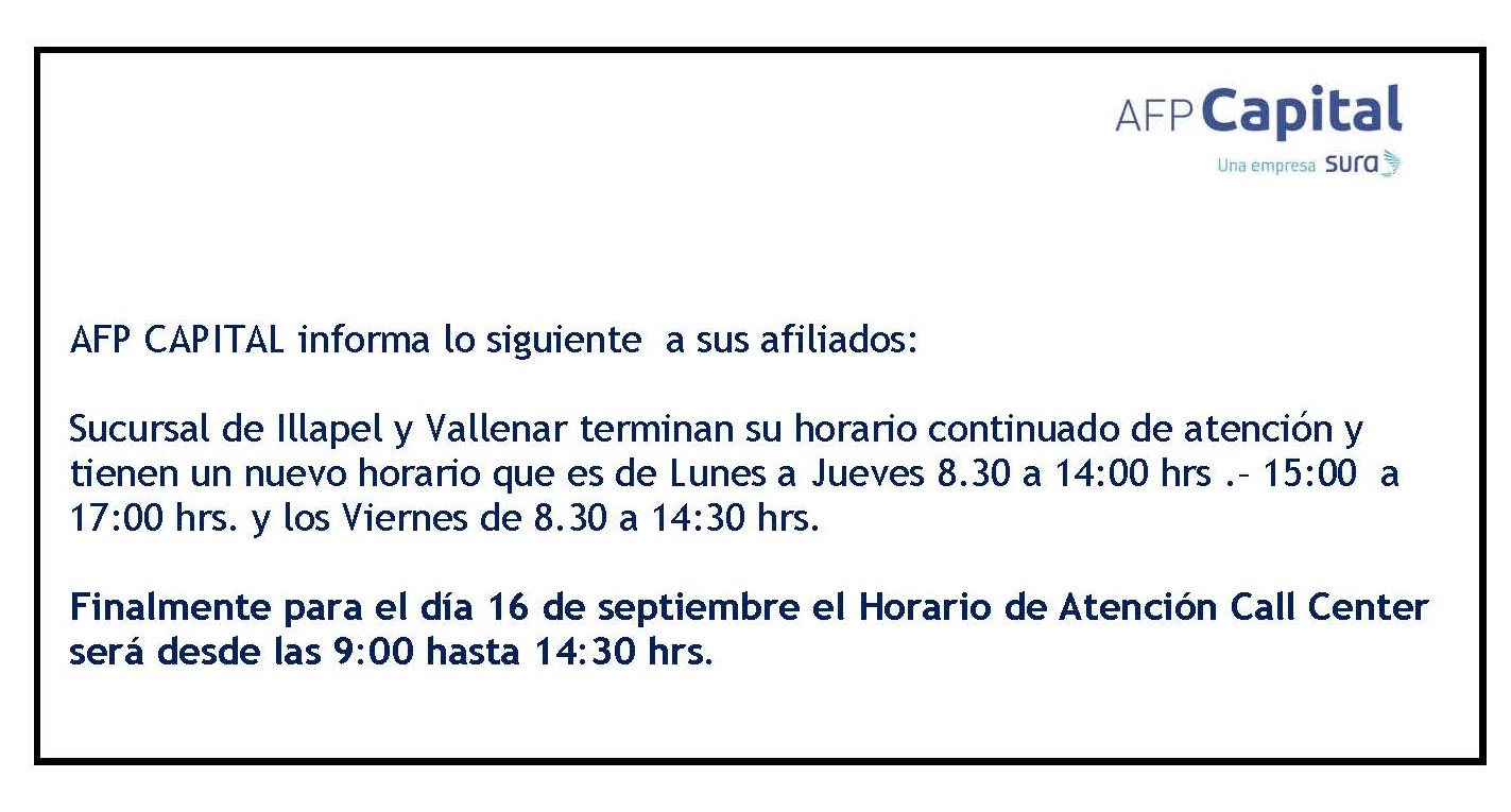 AFP CAPITAL informa los horarios de atención del Call Center y Sucursales de Illapel y Vallenar.