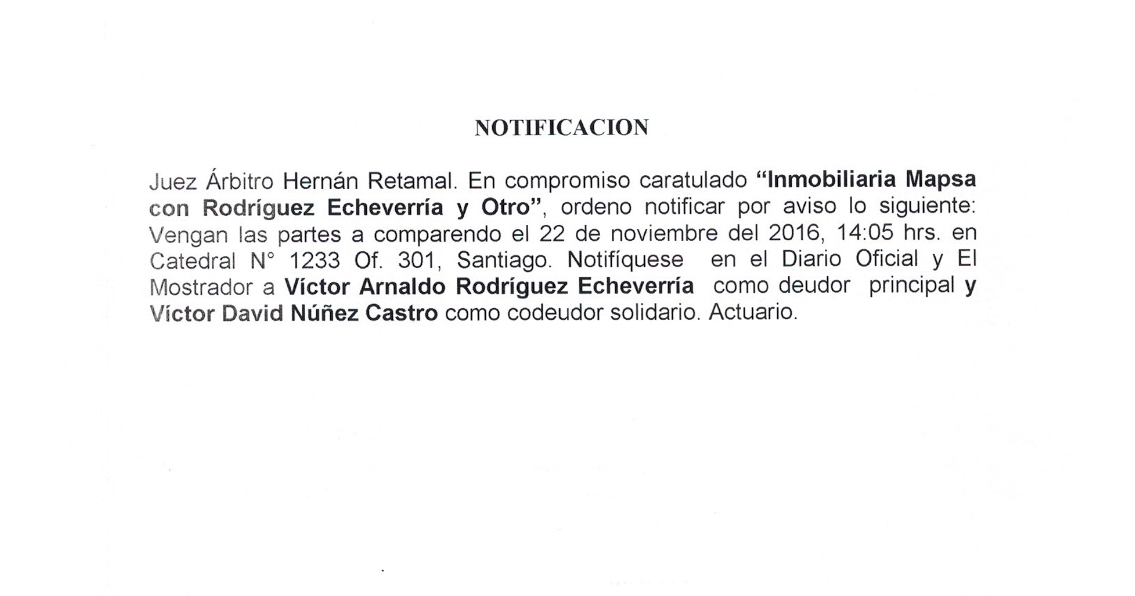Notificación por Aviso a Víctor Arnaldo Rodríguez Echeverría, Compromiso Caratulado "Inmobiliaria Mapsa con Rodríguez Echeverrían y Otro".