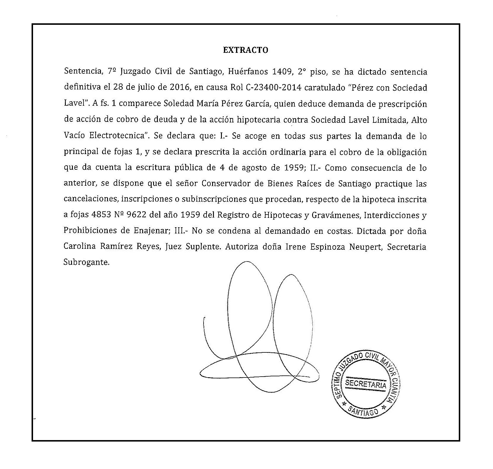 SENTENCIA DEFINITIVA: En causa Rol C-23400-2014 caratulado “Pérez con Sociedad Lavel”. Ante el 7º Juzgado Civil de Santiago