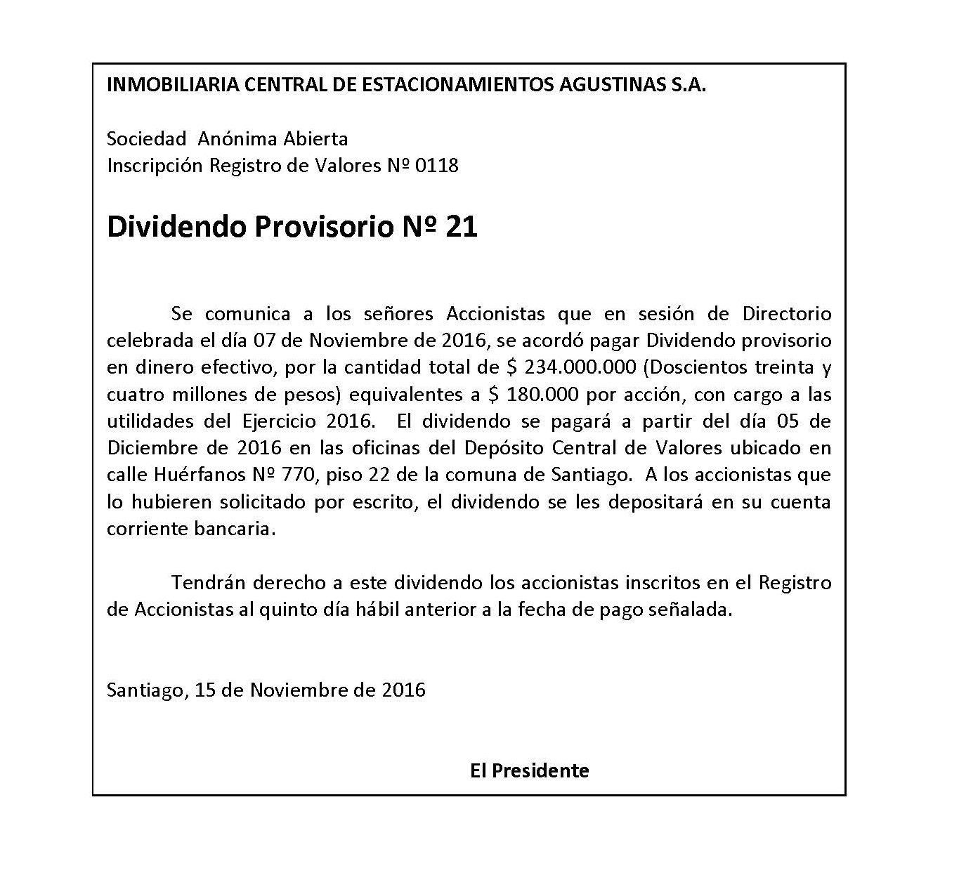 INMOBILIARIA CENTRAL DE ESTACIONAMIENTOS AGUSTINAS S.A.: Dividendo Provisorio Nº 21