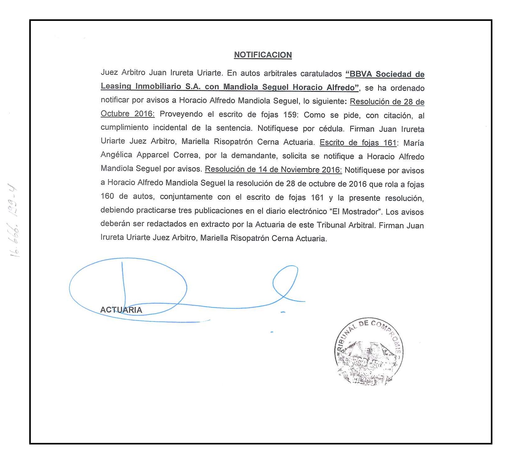 NOTIFICACION: Juez Arbitro Juan Irureta U. En autos caratulados “ BBVA Sociedad de Leasing Inmobiliario S.A. con Mandiola Seguel Horacio Alfredo”. Ha ordenado notificar a Don Horacio Alfredo Maniola