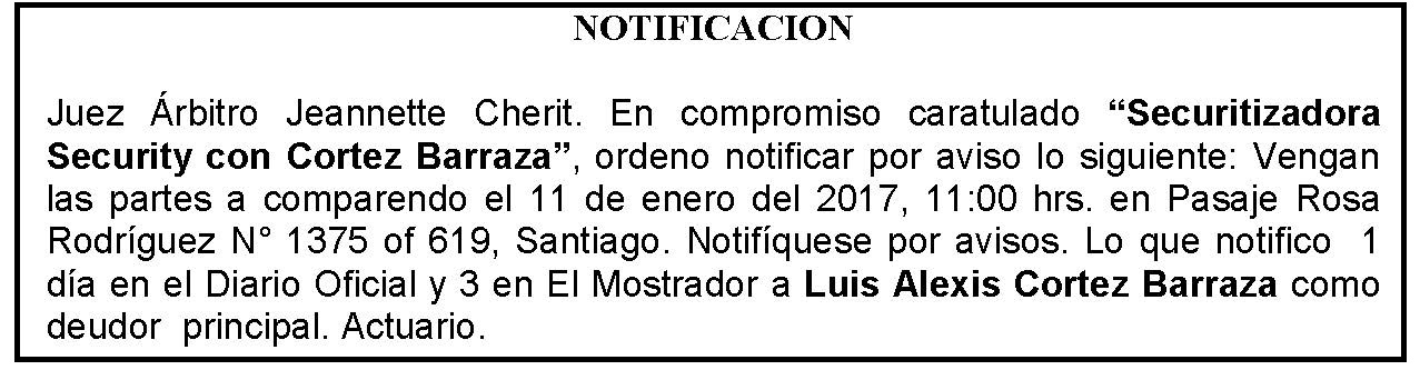 Notificación por Aviso a Luis Alexis Cortez Barraza, Compromiso Caratulado "Securitizadora Security con Cortez Barraza”, Comparendo.