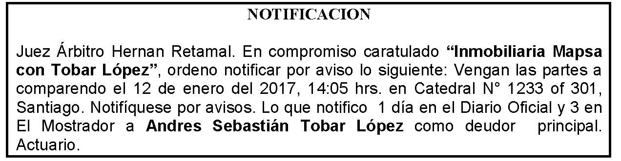 Notificación por Aviso a Andrés Sebastián Tobar López, Compromiso Caratulado "Inmobiliaria Mapsa con Tobar López" Comparendo.