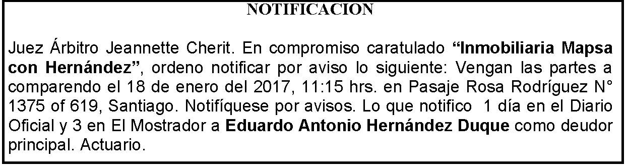 Notificación por Aviso a Eduardo Antonio Hernández Duque, Compromiso Caratulado "Inmobiliaria Mapsa con Hernández" Comparendo.