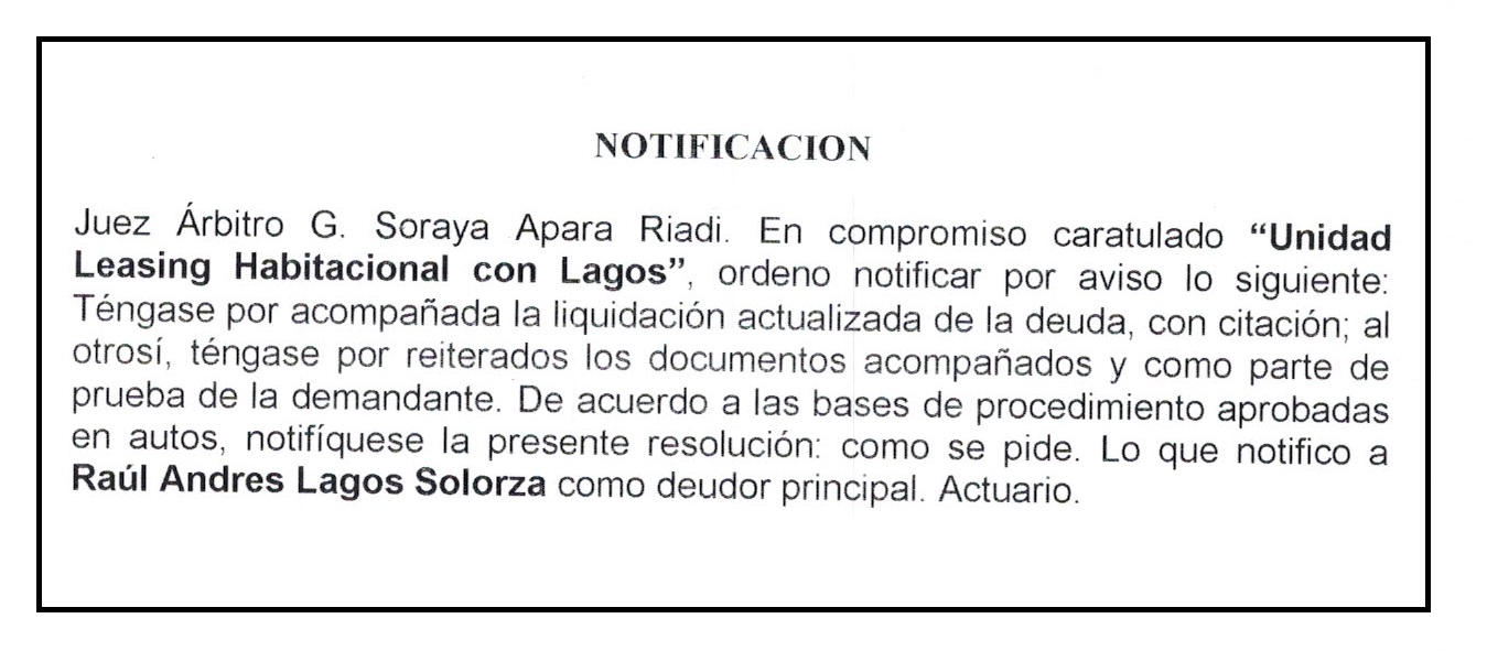 Notificación por Aviso a Raúl Andrés Lagos Solorza, Compromiso Caratulado "Unidad Leasing Habitacional con Lagos"