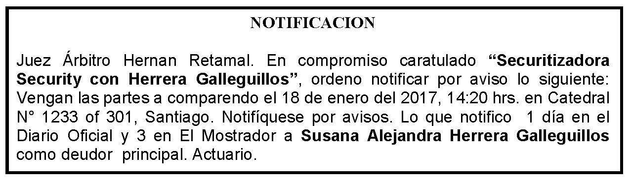 Notificación por Aviso a Susana Alejandra Herrera Galleguillos, Compromiso Caratulado "Securitizadora Security con Herrera Galleguillos"