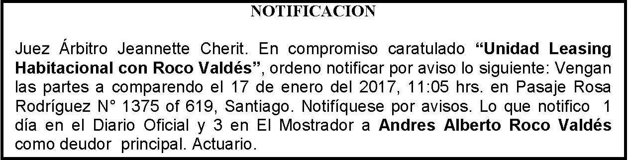 Notificación por Aviso a Andrés Alberto Roco Valdés, Compromiso Caratulado "Unidad Leasing Habitacional con Roco Valdés"