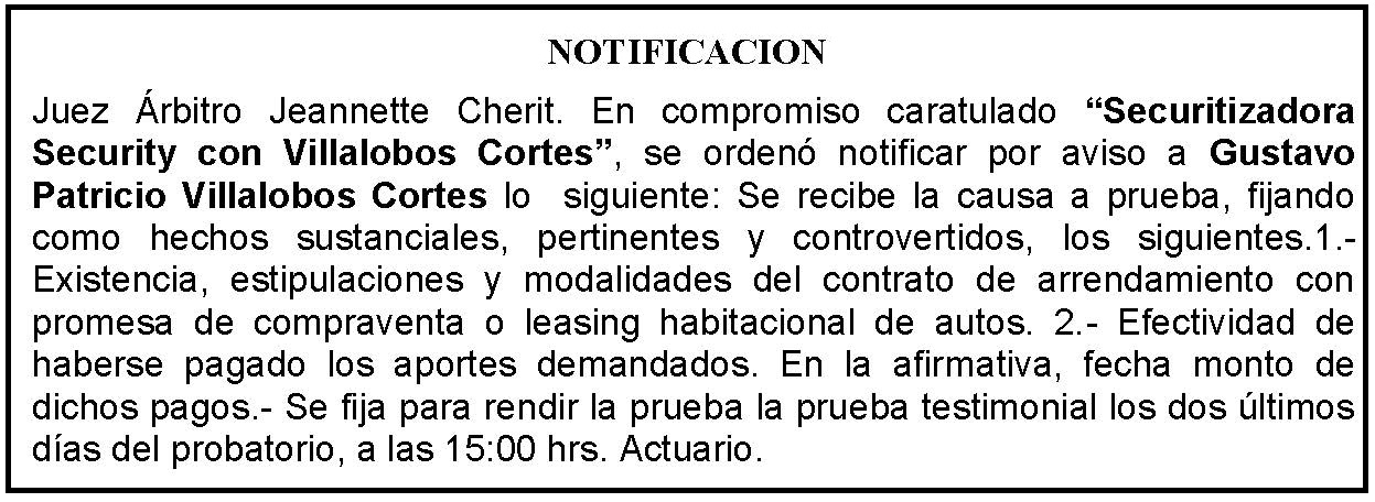 Publicación Notificación por Aviso a Gustavo Patricio Villalobos Cortes, Compromiso Caratulado "Securitizadora Security con Villalobos Cortes" Causa a Prueba.