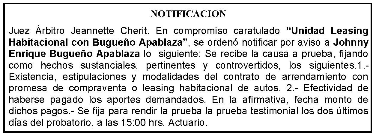 Notificación por Aviso a Johnny Enrique Bugueño Apablaza, Caratulado "Unidad Leasing Habitacional con Bugueño Apablaza" Causa a Prueba.
