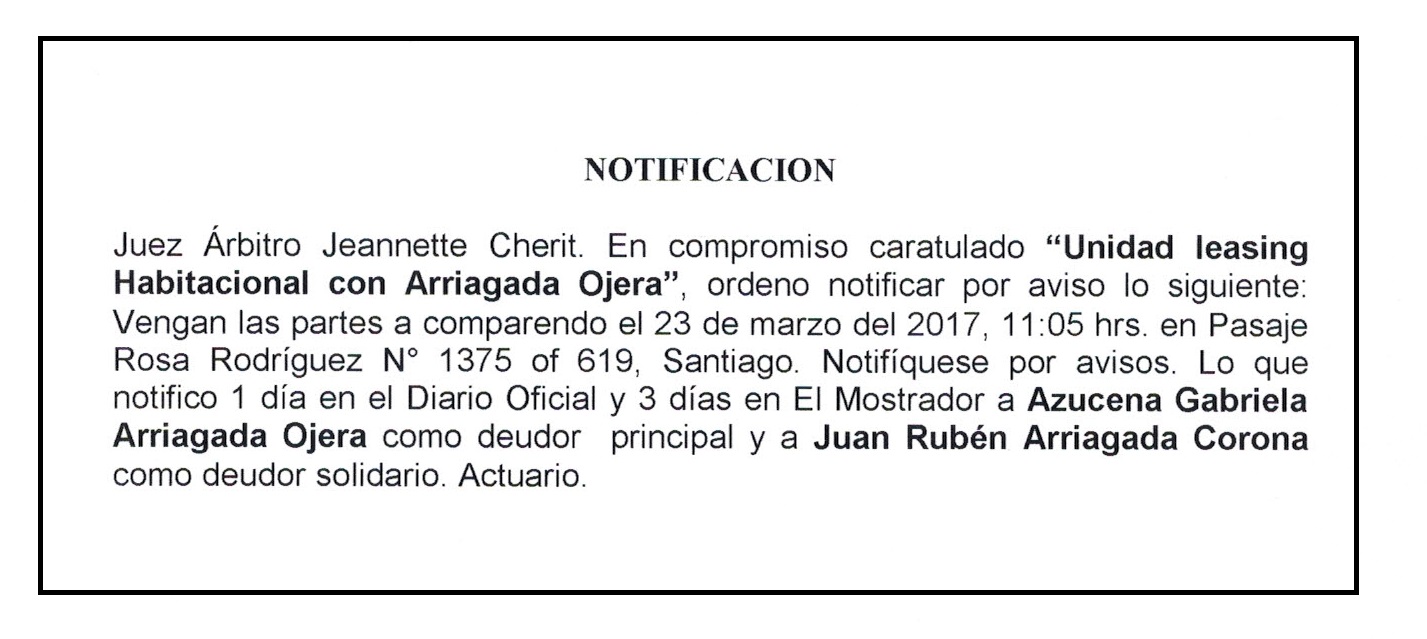 Notificación por Aviso a Azucena Gabriela Arriagada Ojera, Compromiso Caratulado "Unidad Leasing Habitacional con Arriagada Ojera"