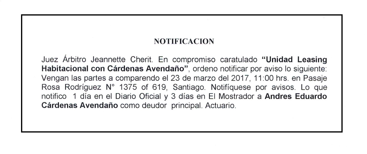 Notificación por Aviso a Andrés Eduardo Cárdenas Avendaño, Compromiso Caratulado "Unidad Leasing Habitacional con Cárdenas Avendaño"