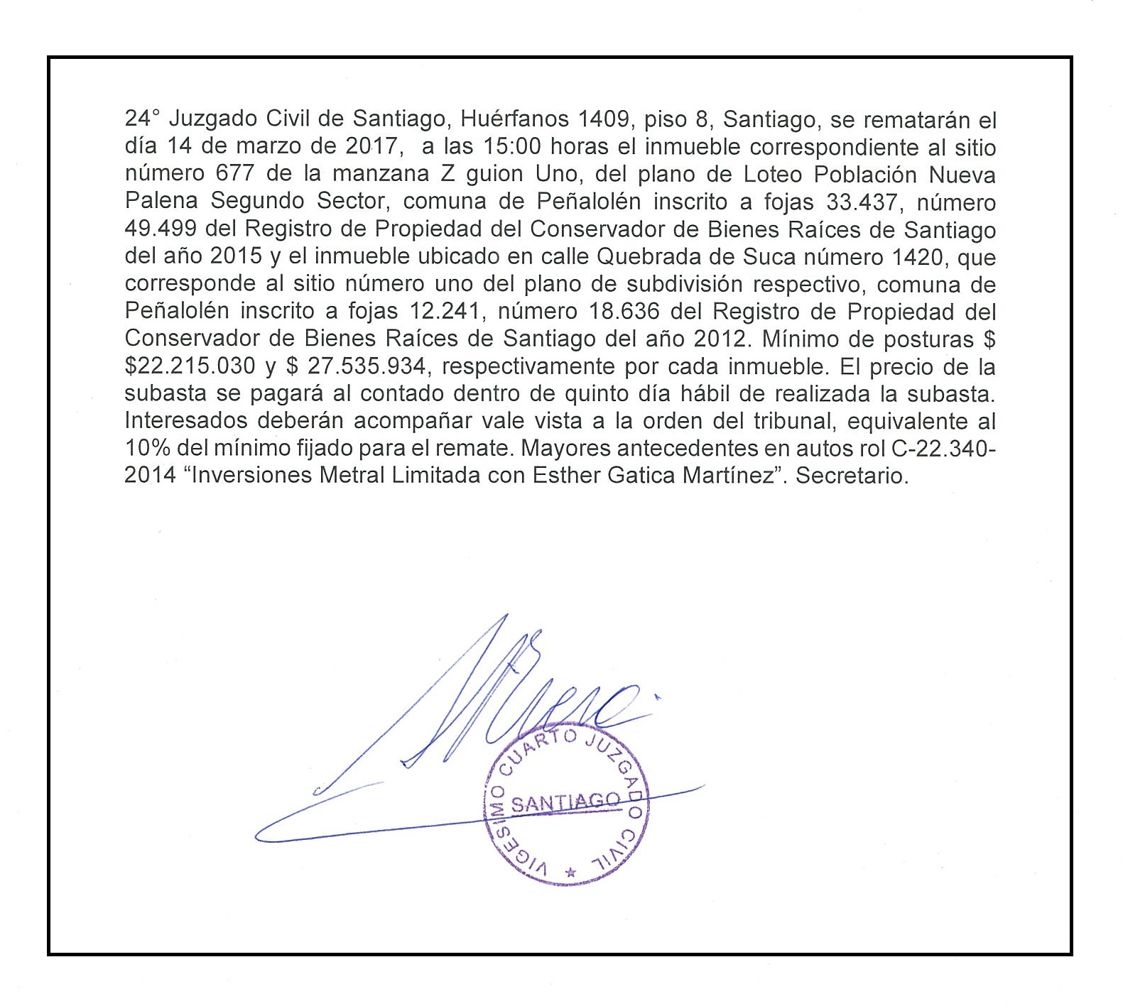 REMATE: 24° Juzgado Civil Santiago, Autos Rol C-22.340-2014, " Inversiones Metral Limitada con Esther Gatica Martínez"”, Inmueble del Sitio 677 Manzana Z-1 Loteo Pobl. Nva. Palena, Peñalolén