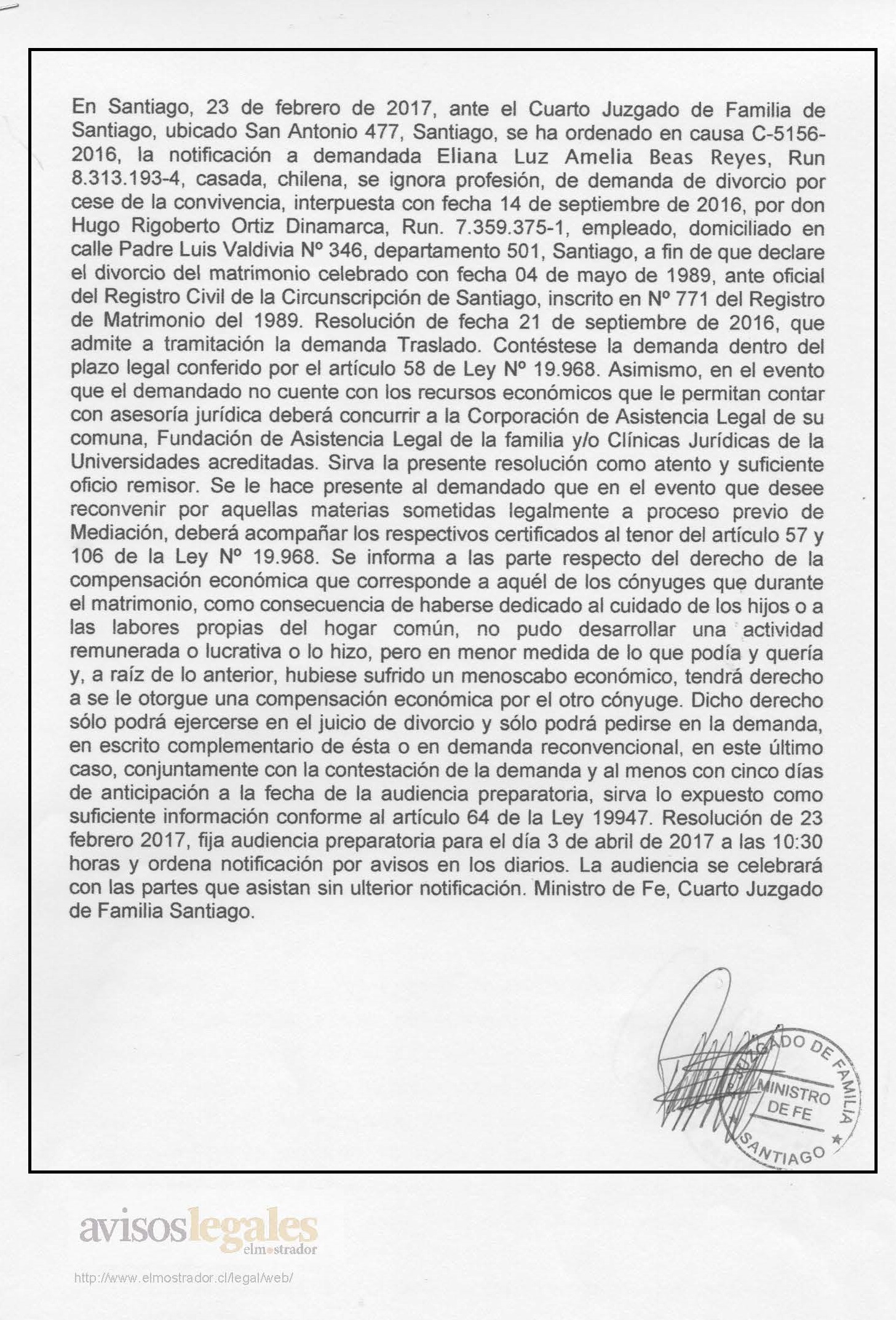 EXTRACTO: Notificación por Avisos a demandada Eliana Luz Amelia Beas Reyes, de demanda de divorcio por cese de la convivencia, Causa C-5156-2016, Cuarto Juzgado de Familia de Santiago.