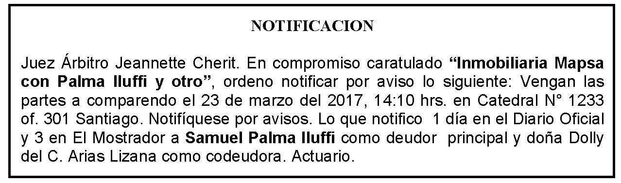 Notificación por Aviso a Samuel Palma Iluffi y Otro, Compromiso Caratulado "Inmobiliaria Mapsa con Palma Iluffi y otro "