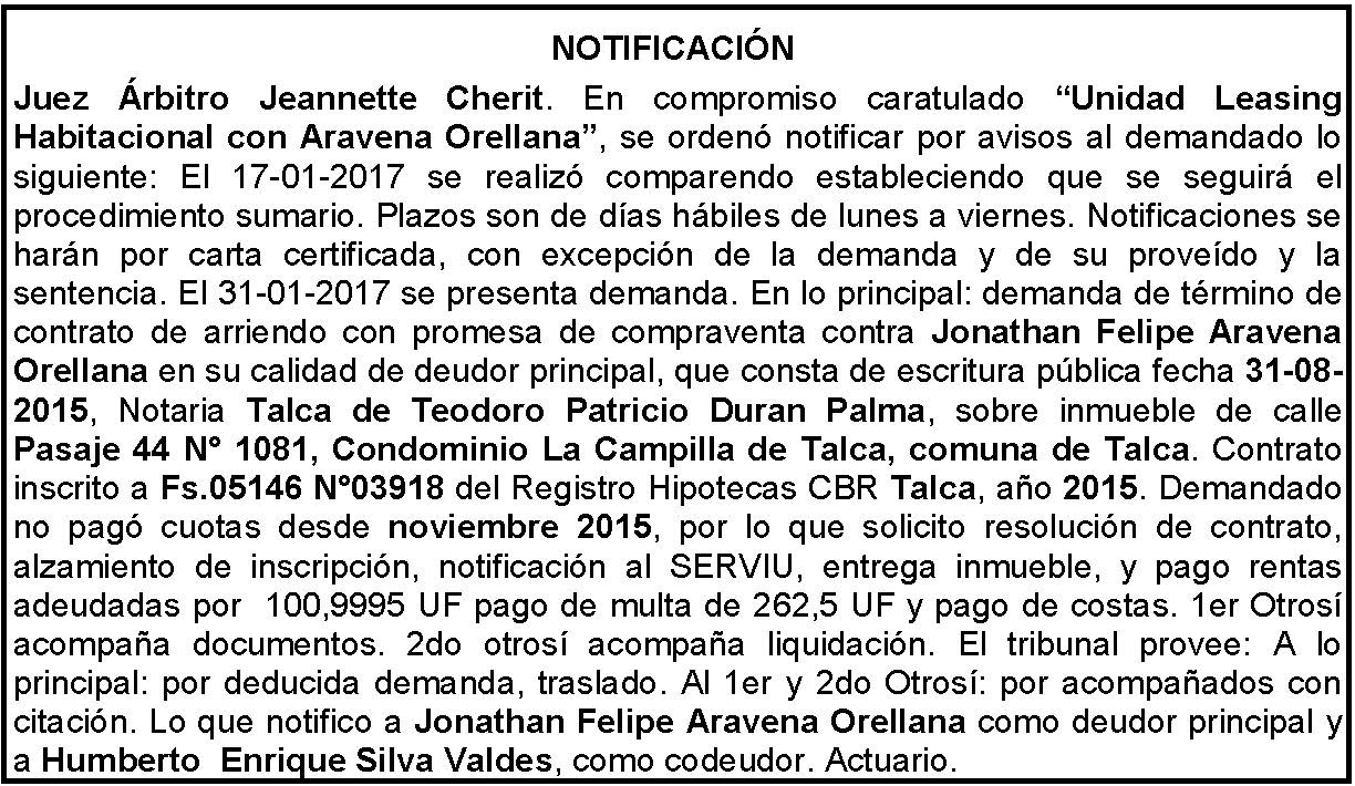 Notificación por Aviso a Jonathan Felipe Aravena Orellana, Compromiso Caratulado "Unidad Leasing Habitacional con Aravena Orellana" Demanda.