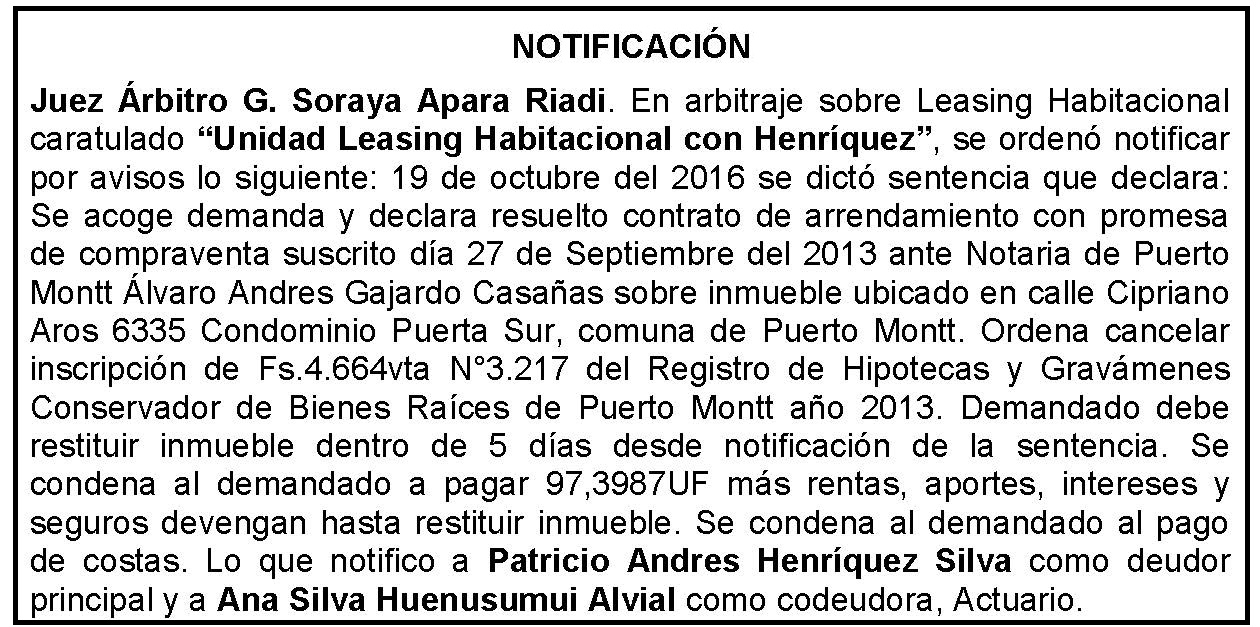 Notificación por Aviso a Patricio Andres Henríquez Silva, Compromiso Caratulado "Unidad Leasing Habitacional con Henríquez" Fallo.