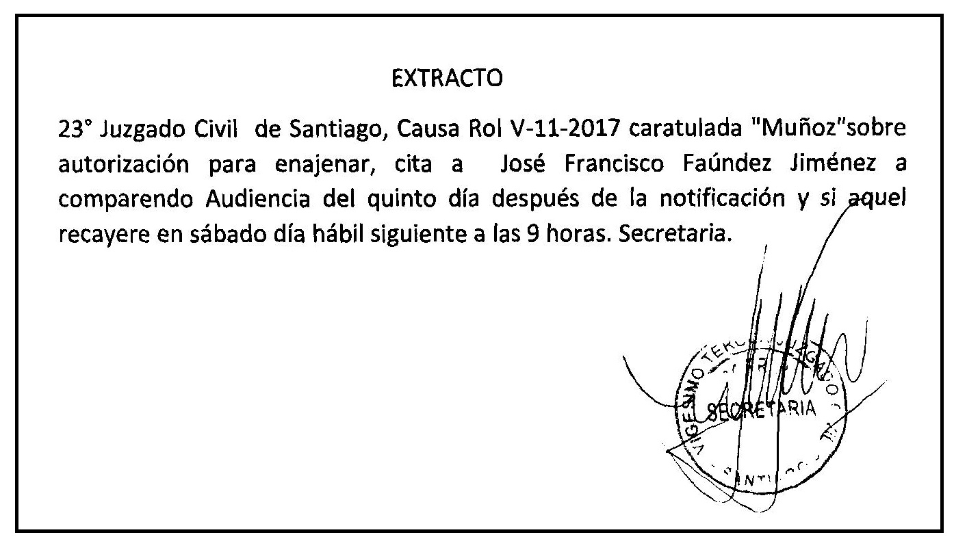 EXTRACTO: Notificación por Avisos a José Francisco Faúndez Jiménez, 23° Juzgado Civil de Santiago, Causa Rol V-11-2017, caratulada “Muñoz”.