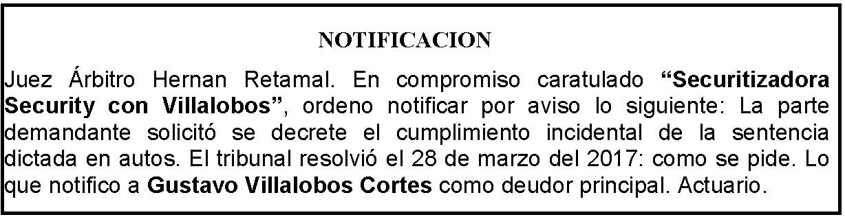 Notificación por Aviso a Gustavo Villalobos Cortes, Compromiso Caratulado "Securitizadora Security con Villalobos Cortes" Cumplimiento Incidental