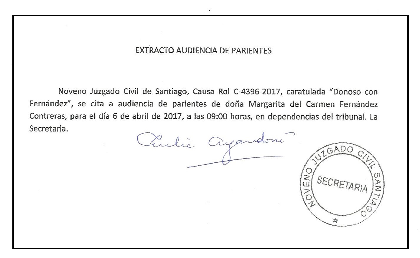 EXTRACTO: Aviso Citación Audiencia de Parientes en causa caratulada “Donoso con Fernández”, Causa Rol C-4396-2017, Noveno Juzgado Civil de Santiago.
