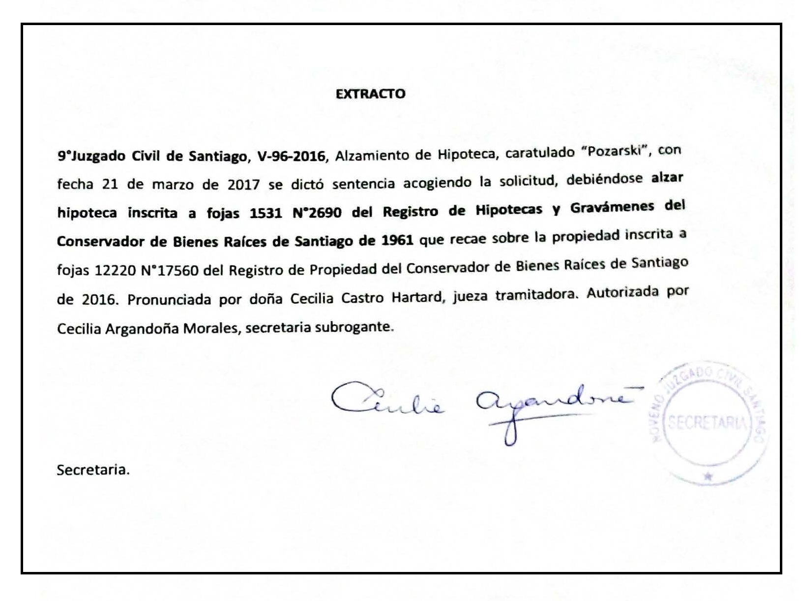 EXTRACTO: SENTENCIA ALZAMIENTO DE HIPOTECA, CARATULADO “POZARSKI”, CAUSA ROL V-96-2016 ANTE EL 9°JUZGADO CIVIL DE SANTIAGO
