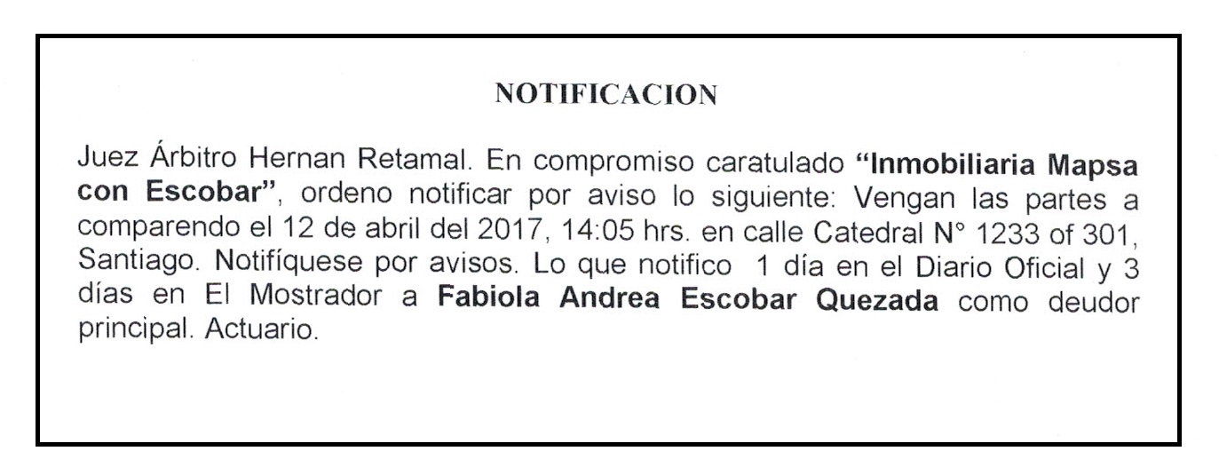 Notificación por Aviso a Fabiola Andrea Escobar Quezada, Compromiso Caratulado "Inmobiliaria Mapsa con Escobar"