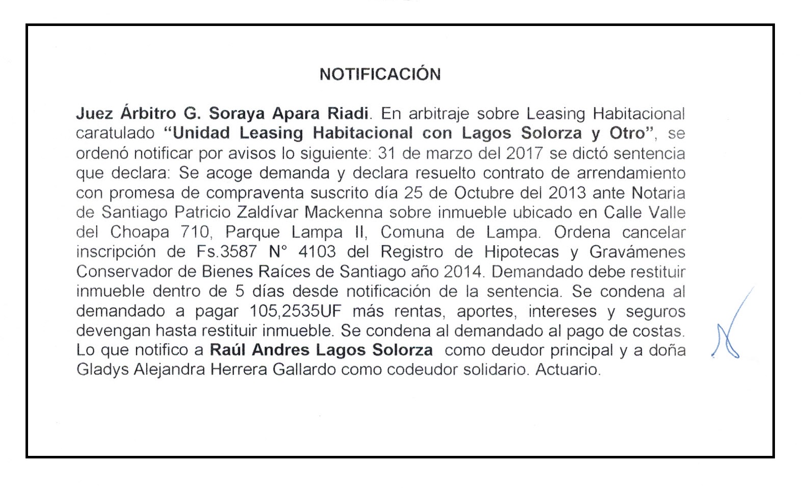 Notificación por Aviso a Raúl Andrés Lagos Solorza, Compromiso Caratulado "Unidad Leasing Habitacional con Lagos Solorza y Otro" Sentencia.