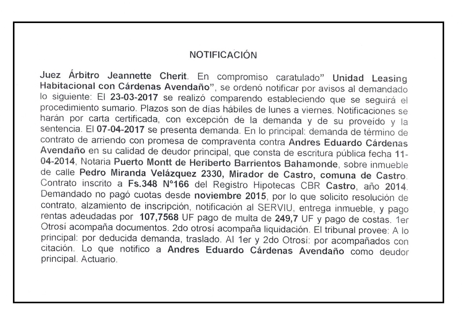 Notificación por Aviso a Andrés Eduardo Cárdenas Avendaño, Compromiso Caratulado "Unidad Leasing Habitacional con Cárdenas Avendaño" Demanda.
