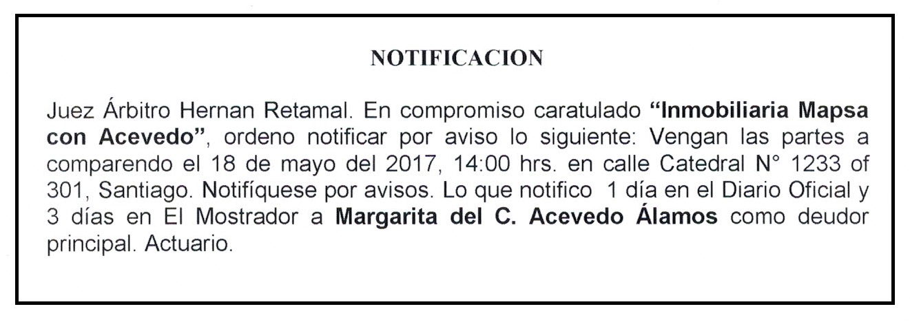 Notificación por Aviso a Margarita del C. Acevedo Alamos, Compromiso Caratulado "Inmobiliaria Mapsa con Acevedo”