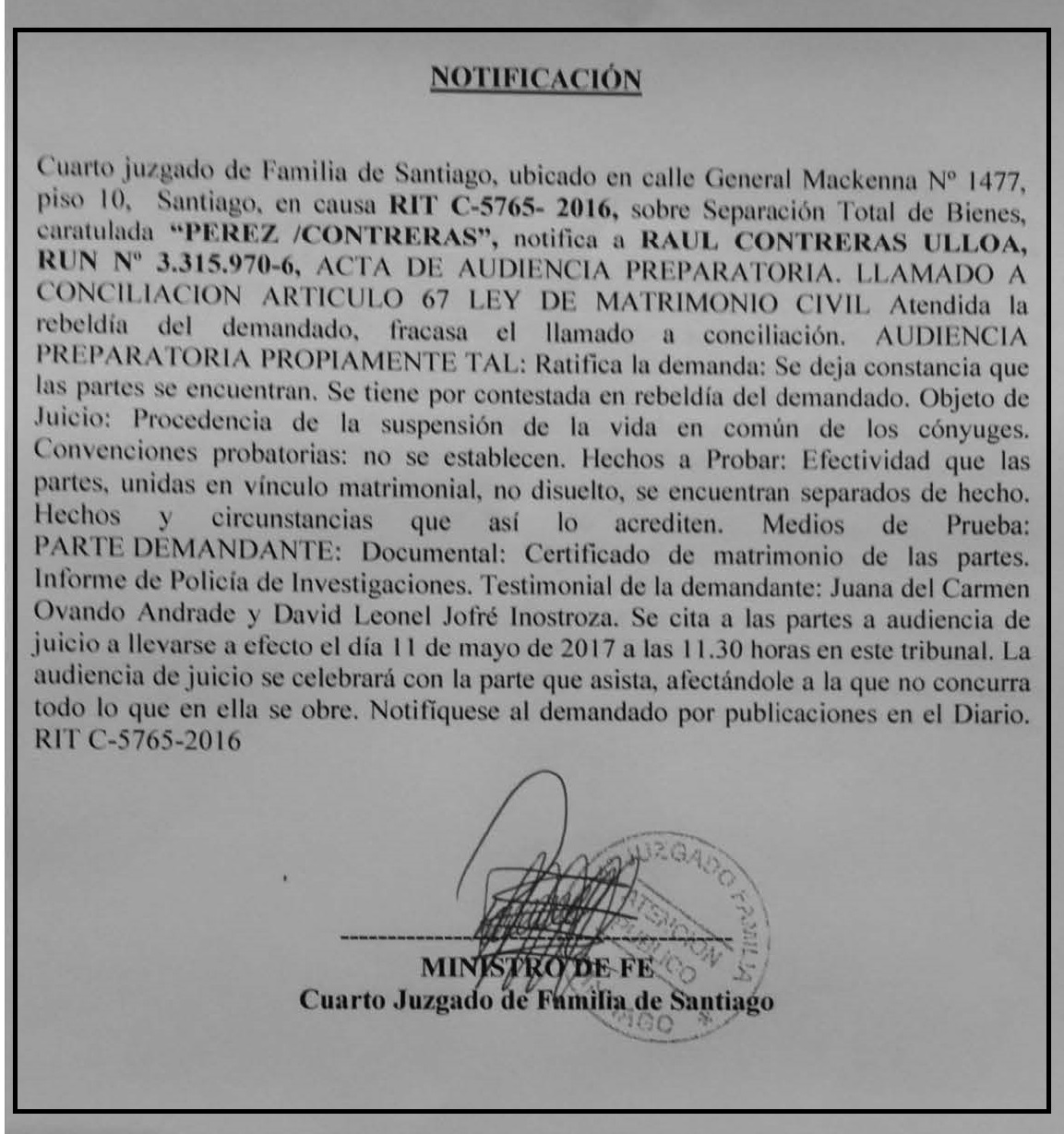Notificación por Avisos a don Raúl Contreras Ulloa: Acta de Audiencia Preparatoria, Caratulada "PEREZ/CONTRERAS", causa Rit 5765-2016. Cuarto Juzgado de Familia de Santiago.