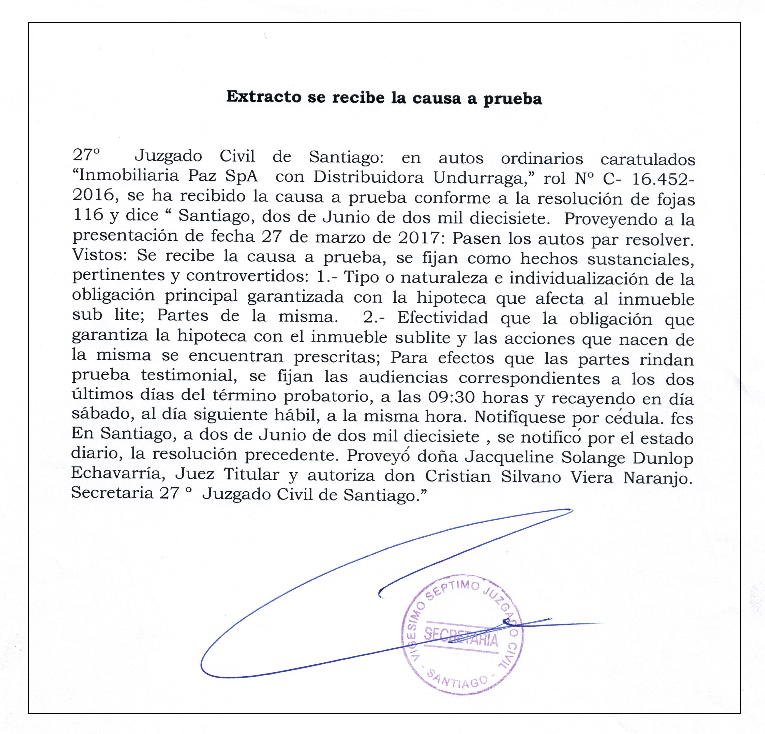 Extracto se recibe la causa a prueba en causa rol N° C-16-452-2016, caratulado “Inmobiliaria Paz SpA con Distribuidora Undurraga”. 27° Juzgado Civil de Santiago