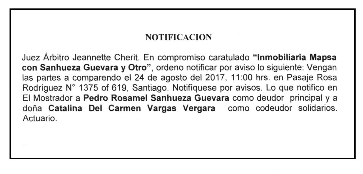 Notificación por Aviso a Pedro Rosamel Sanhueza Guevara, Compromiso Caratulado "Inmobiliaria Mapsa con Sanhueza Guevara y Otro".