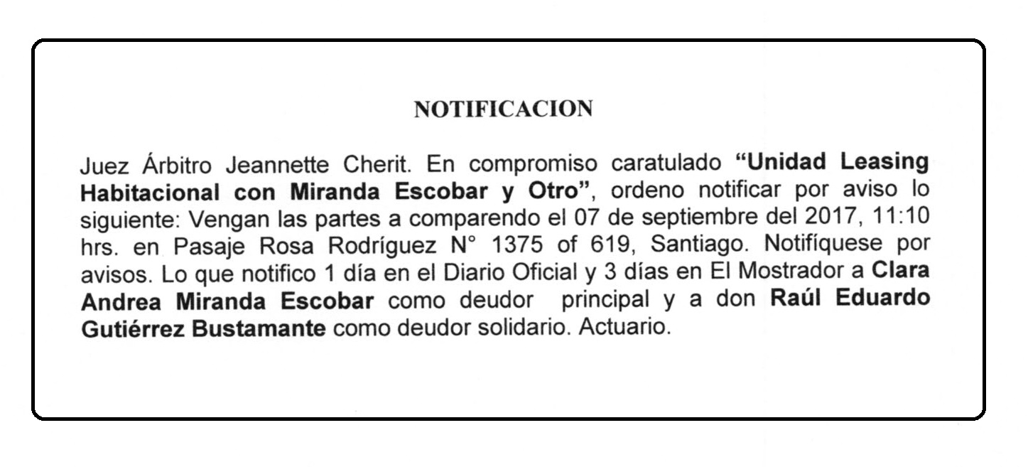 Notificación por Aviso a Clara Andrea Miranda Escobar, Compromiso Caratulado "Unidad Leasing Habitacional con Miranda Escobar y Otro"