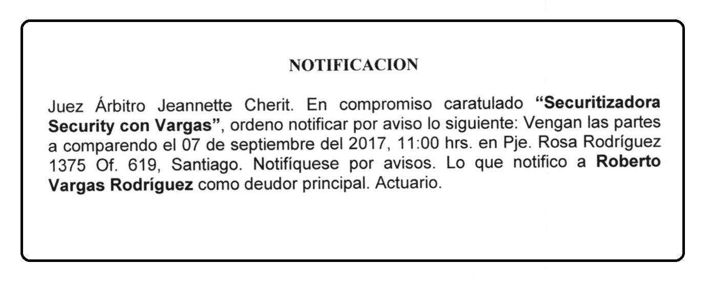 Notificación por Aviso a Roberto Vargas Rodríguez, Compromiso Caratulado "Securitizadora Security con Vargas"
