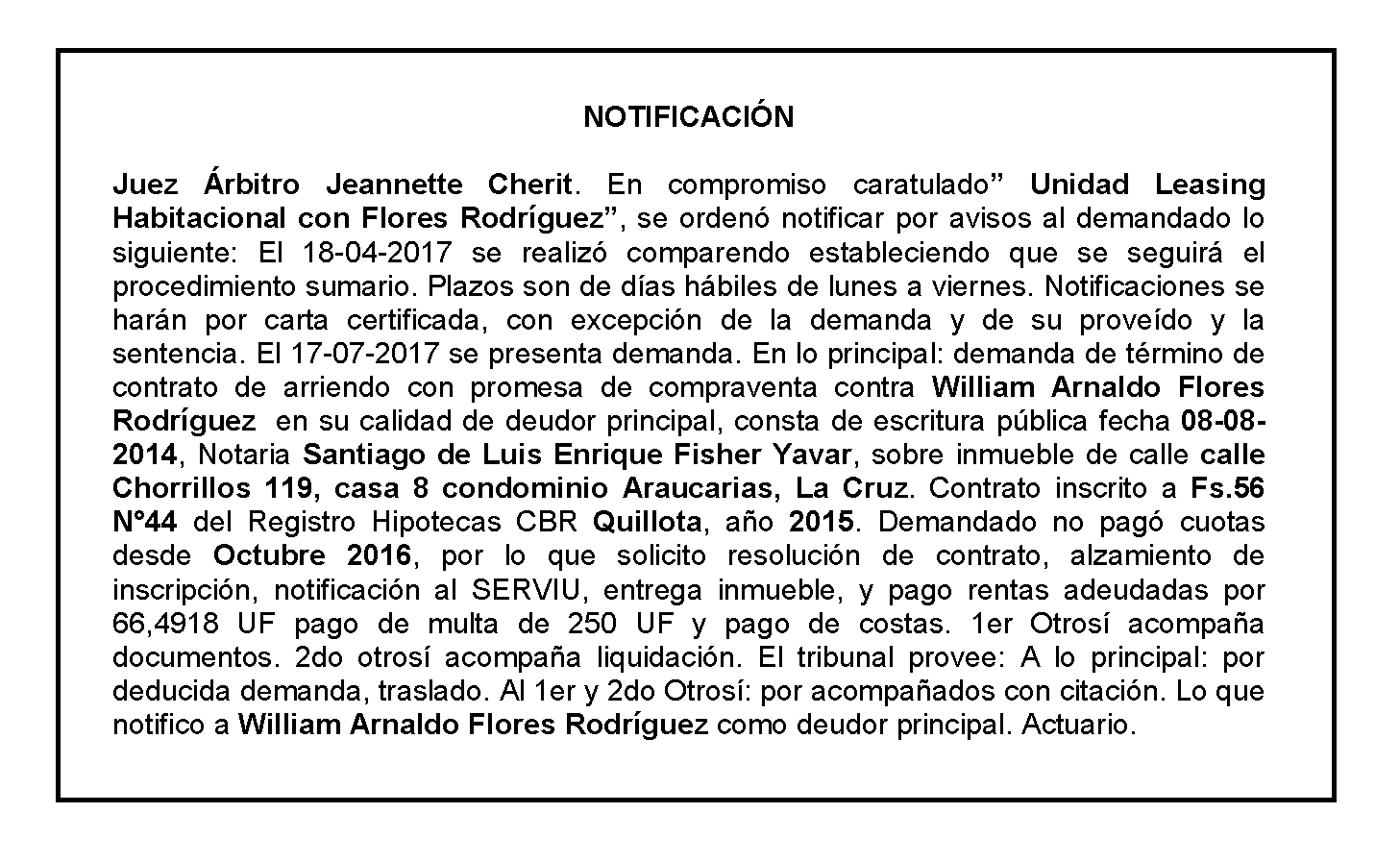 Notificación por Aviso a William Arnaldo Flores Rodríguez, Compromiso Caratulado "Unidad Leasing Habitacional con Flores Rodríguez"