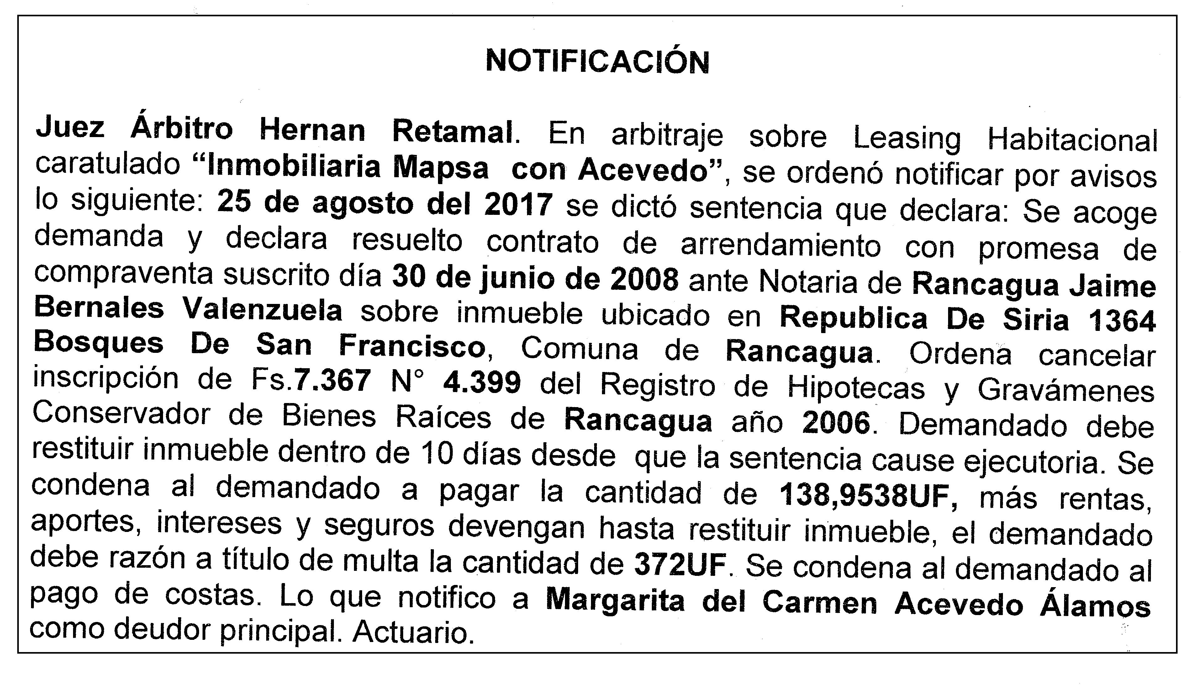 Notificación por Aviso a Margarita del Carmen Acevedo Álamos, Compromiso Caratulado "Inmobiliaria Mapsa con Acevedo"