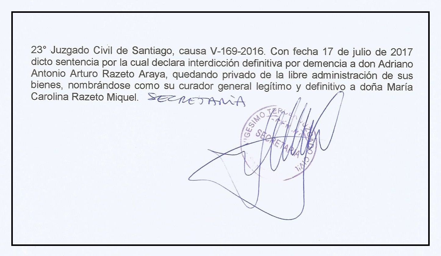 NOTIFICACIÓN: 23° Juzgado Civil de Santiago, Causa V-169-2016 con fecha 17 de Julio de 2017 se dictó sentencia por la cual declara Interdicción Definitiva por Demencia a don Adriano Antonio Arturo Razeto Araya.