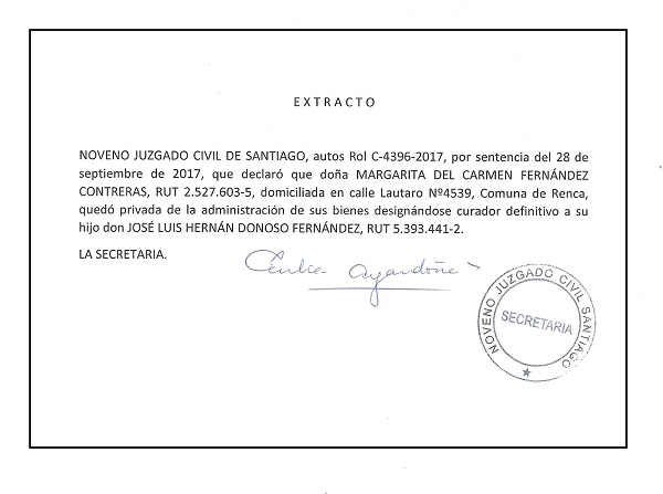 EXTRACTO: Notificación por avisos de Sentencia de Interdicción por Demencia de doña Margarita del Carmen Fernández Contreras, Noveno Juzgado Civil de Santiago,Autos Rol C-4396-2017