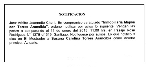 Notificación por Aviso a Susana Carolina Torres Arancibia, Compromiso Caratulado "Inmobiliaria Mapsa con Torres Arancibia".