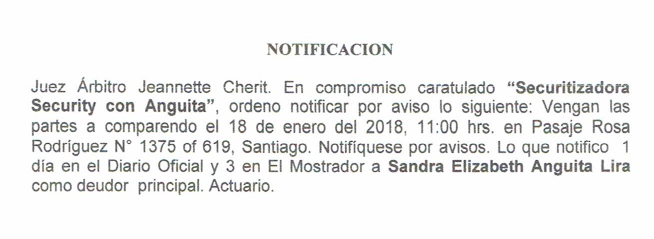 Notificación por Aviso a Sandra Elizabeth Anguita Lira, Compromiso Caratulado "Securitizadora Security con Anguita"