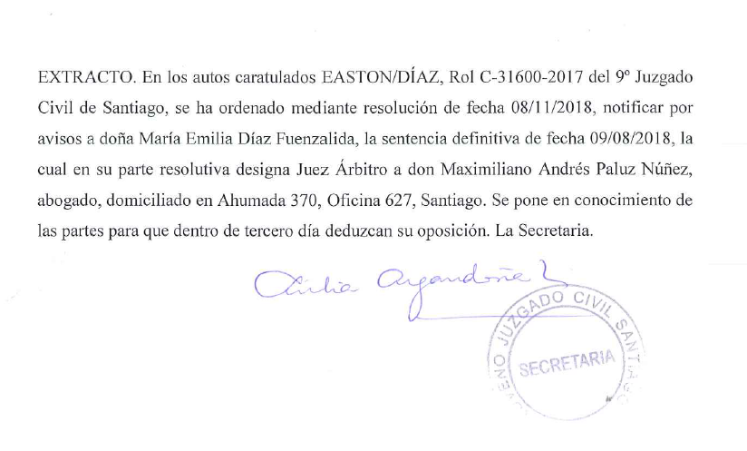 EXTRACTO 9° JUZGADO DE LETRAS EN LO CIVIL DE SANTIAGO, DICTO SENTENCIA DEFINITIVA,CAUSA EASTON/DIAZ,ROL C-31600-2017.
