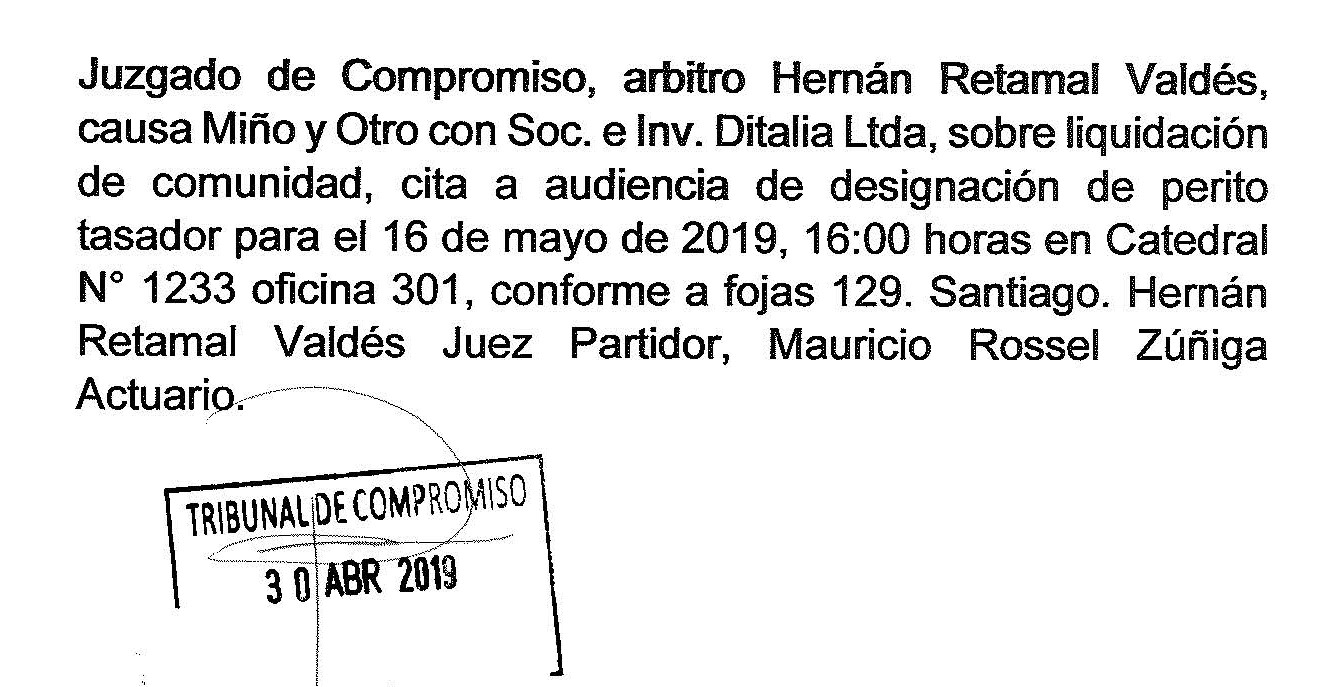 EXTRACTO: NOTIFICACIÓN POR AVISOS JUZGADO DE COMPROMISO CAUSA MIÑO Y OTRO CON SOC. E INV. DITALIA LTDA.,SOBRE LIQUIDACIÓN DE COMUNIDAD CITA A AUDIENCIA DE DESIGNACIÓN DE PERITO TASADOR.