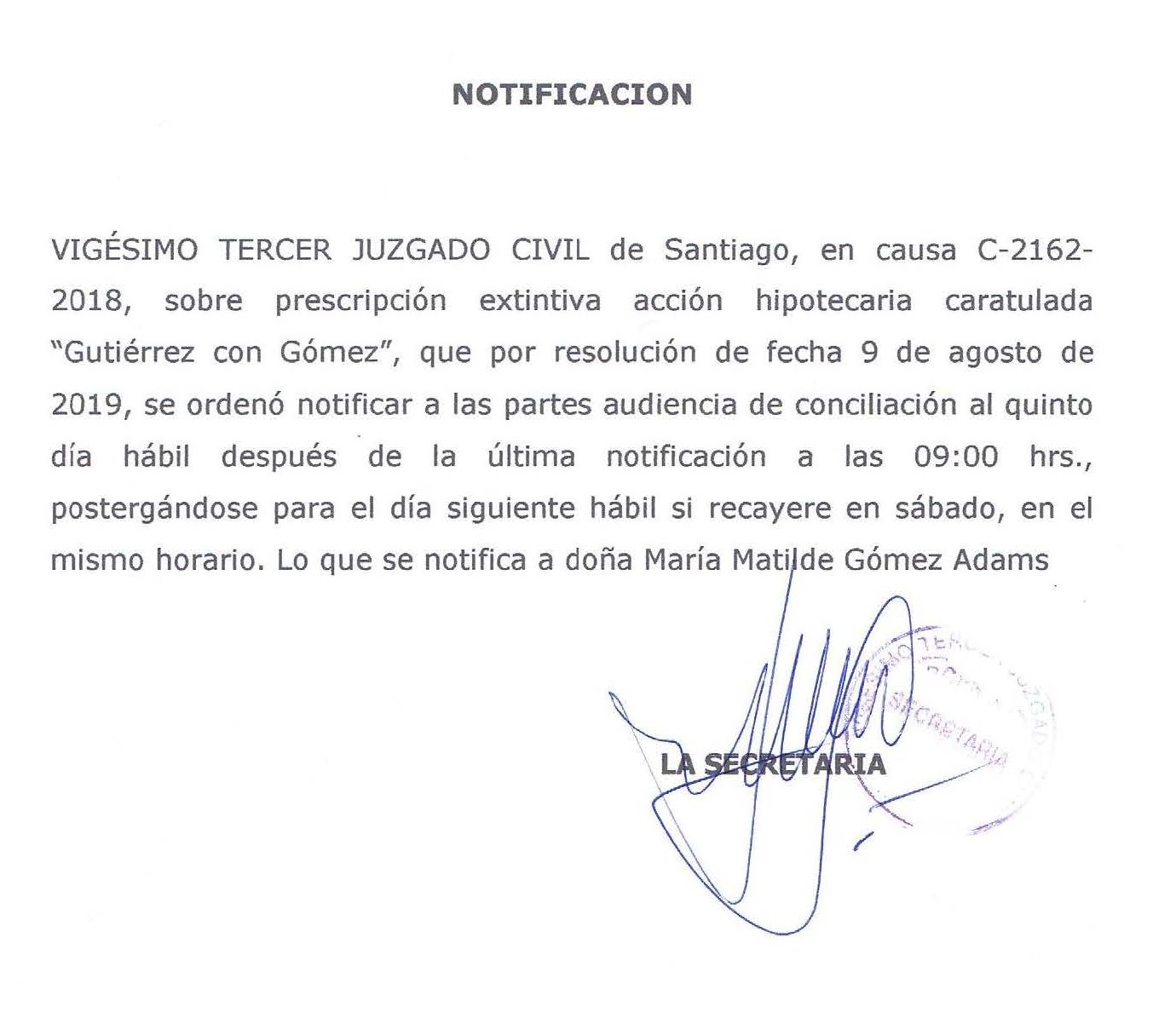 NOTIFICACIÓN: 23° Juzgado Civil de Santiago, en causa C-2162-2018, Sobre prescripción extintiva acción hipotecaria Caratulada “ Gutiérrez Con Gómez”. Audiencia de Conciliación.