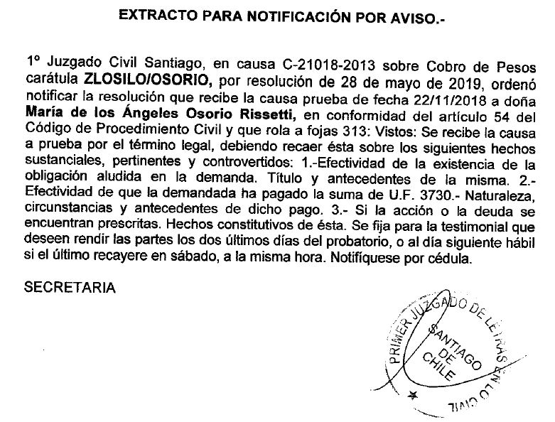 EXTRACTO NOTIFICACIÓN POR AVISOS: 1°Juzgado civil Stgo., caratulada ZLOSILO/OSORIO causa a prueba a doña María de los Ángeles Osorio Risetti.