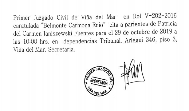 NOTIFICACIÓN POR AVISOS: Causa caratulada “Belmonte Carmona Enio”en 1° Juzgado Civil de Viña del Mar. Cita a los parientes de Patricia del Carmen Laniszewski Fuentes, en las dependencias del Tribunal.