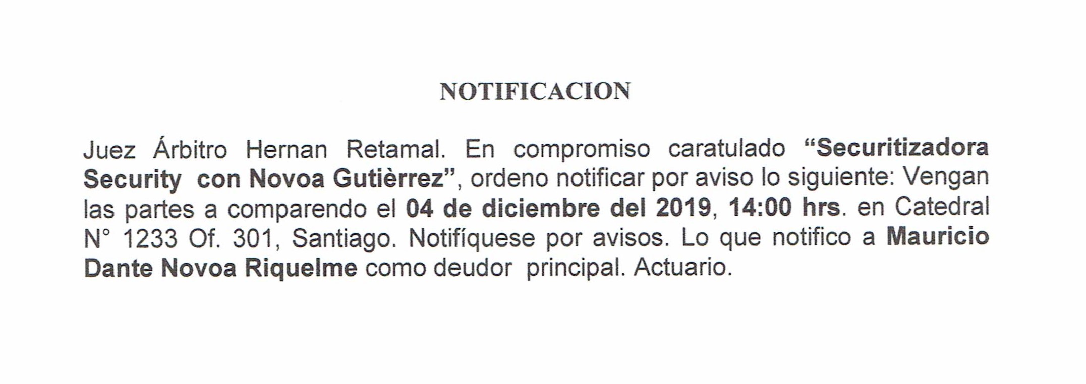 Notificación por Aviso a Mauricio Dante Novoa Gutiérrez, Compromiso Caratulado "Securitizadora Security con Novoa Gutiérrez" Comparendo