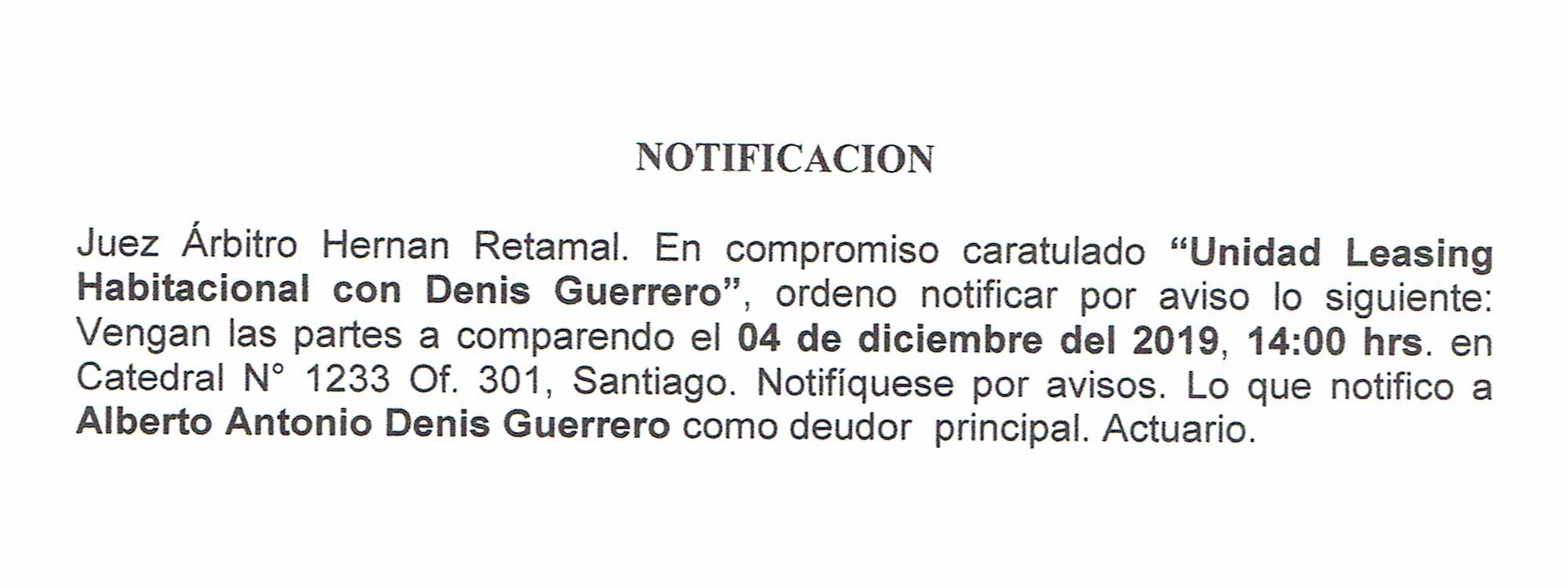 Notificación por Aviso a Alberto Antonio Denis Guerrero, Compromiso Caratulado "Unidad Leasing Habitacional con Denis Guerrero" Comparendo.