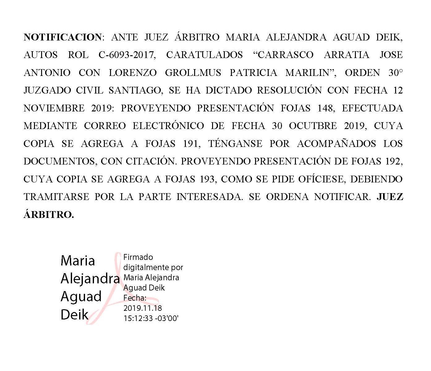 NOTIFICACION POR AVISOS: JUEZ ÁRBITRO MARIA ALEJANDRA AGUAD DEIK, AUTOS ROL C-6093-2017, CARATULADOS “CARRASCO ARRATIA JOSE ANTONIO CON LORENZO GROLLMUS PATRICIA MARILIN”, ORDEN 30° JUZGADO CIVIL STGO., HA DICTADO RESOLUCIÓN.