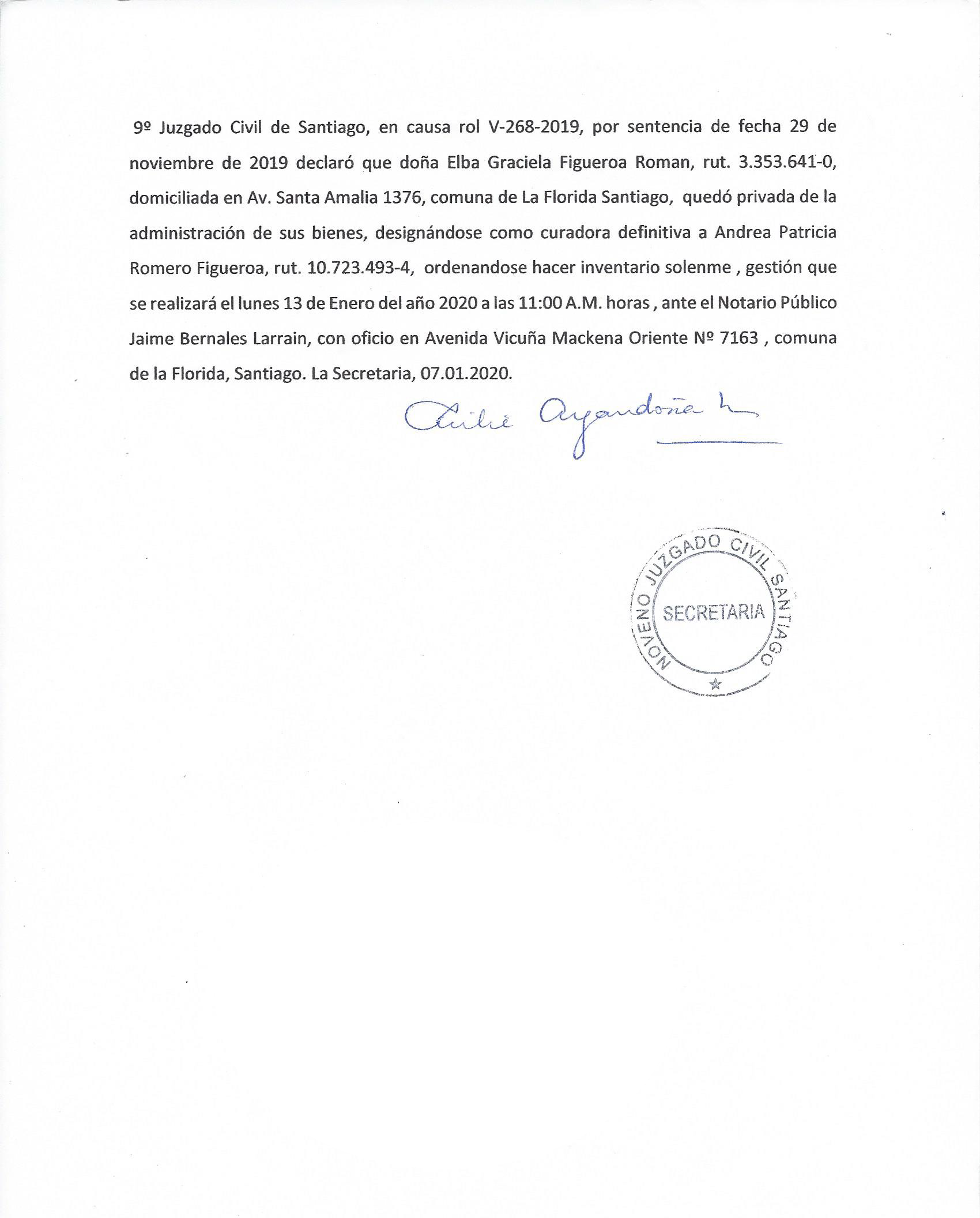 CITACIÓN A FACCIÓN INVENTARIO SOLEMNE DE BIENES DE DOÑA. ELBA GRACIELA FIGUEROA ROMAN QUEDO PRIVADA DE LA ADMINISTRACIÓN DE BIENES, CAUSA ROL V-268-2019, 9° JUZGADO CIVIL DE SANTIAGO