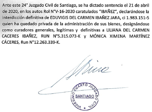 EXTRACTO: ANTE EL 24° JUZGADO DE LETRAS CIVIL DE STGO. AUTOS ROL N° V-16-2020 CARATULADOS “IBAÑEZ” SE DICTÓ SENTENCIA DE INTERDICCIÓN DEFINITIVA DE “EDUVIGIS DEL CARMEN IBAÑEZ LARA”